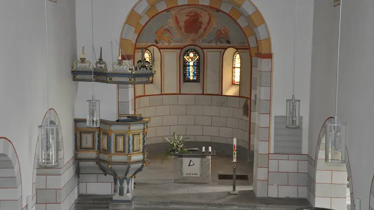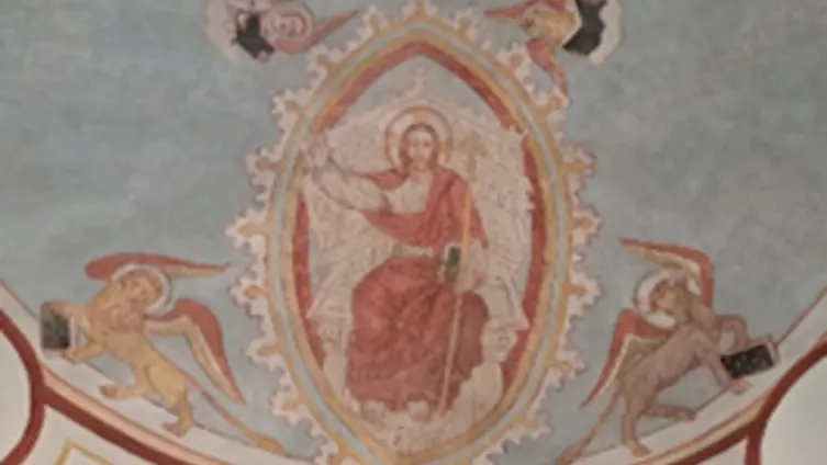 Während die Kirche des 13. Jahrhunderts eigentlich eine figürlich reich ausgemalte war, fielen in unserer Kirche alle Gemälde späteren Baumaßnahmen zum Opfer. Einzig ein "Christus Pantokrator" – „Christus Weltenherrscher“, wohl aus dem 13. Jh., konnte restauriert werden. Christus ist flankiert von den Überbringern der Frohen Botschaft, den vier Evangelisten, die mit ihren Evangelisten-Symbolen dargestellt sind: Matthäus als Engel, Markus als Löwe, Lukas als Stier und Johannes als Adler. Als Attribut ist neben Heiligenschein und Flügeln auch das jeweils von ihnen verfasste Evangelium in Buchform zu sehen.